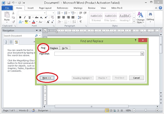 В опциите под полето за търсене (Find) могат да се използват разширени опции.